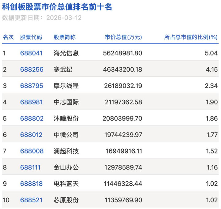 礼貌3月12日收盘,寒武纪股价为1099.00元/股,市值为4634.32亿元,股价在A股仅次于贵州茅台,市值在科创板仅次于海光信息。